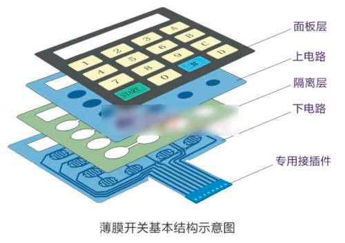 薄膜開關(guān)是集按鍵功用、指示元件、儀器面板為一體的一個(gè)操作系統(tǒng)。是選用PC,PET,F(xiàn)PC及雙面膠等軟性資料,運(yùn)用絲網(wǎng)印刷技術(shù)制造而成的 多平面組合密封的集圖形、按鍵、標(biāo)記符號(hào)顯示、導(dǎo)電及薄膜開關(guān)功用于一體的塑膠電子制品。廣泛應(yīng)用于電子通訊、工業(yè)操控、醫(yī)療器械、汽車工業(yè)、儀器儀表、家用電器、兒童玩具、軍工設(shè)備等行業(yè)和領(lǐng)域。常見薄膜開關(guān)各部分組成原料:
